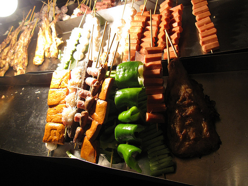 我們還買了一堆豬血糕,老闆切片時問我們要不要現吃,現烤現吃最棒了,大家一試果然如此,熱熱軟軟的相當不錯。