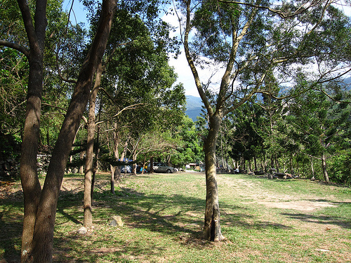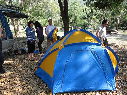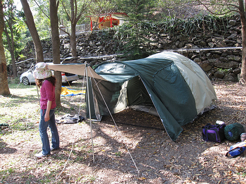帳篷全部弄完,此時才三點多,可以自由活動,但高雄的天氣蠻熱的,此時應該有近30度,因此沒人想去泡溫泉,聚在客廳帳旁聊天,莉雅還裝貴婦撐起傘來(全場只有她一個人撐傘)