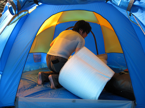 宥奕在舖墊子。不過這個墊子不能防小石頭,最好自己帶睡墊or巧拼。