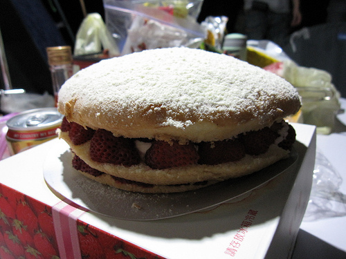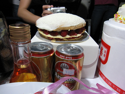 生日蛋糕,前方是我帶去的吳哥啤酒、莉雅帶的大湖草莓酒。