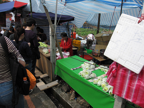 經過通道往後面走,今年路邊攤較去年增加許多,都是擺在道路外的農地上,所以天元宮也管不著。