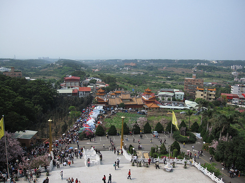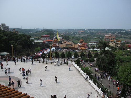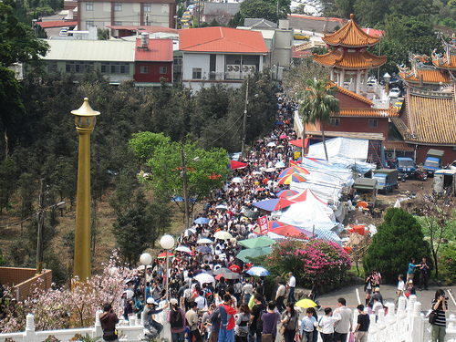 從花園旁邊下樓梯,回到天元宮廣場,此時有人穿櫻花色浴衣來外拍,吸引人潮圍觀。