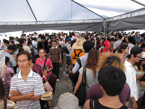 15:28 帳篷裡的盛況,此處約有13道隊伍來回排列,還好太陽已被雲遮住,且帳篷裡有電風扇,所以比較涼一點。
